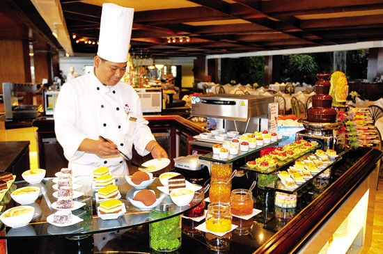 自助餐的取餐臺(tái),其用光需求必然是:讓大家清晰看見(jiàn)菜肴,一覽無(wú)遺地方便挑選,因此,提供均勻的較高照度,以及配合需要表現(xiàn)美感的食品陳列作重點(diǎn)渲染,就是主要的手法。